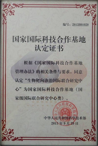 生物靶向诊治国家国际联合研究中心以2008年中心的国家科技部国际合作专项目—异源肿瘤疫苗研究为基础,从重大疾病发生机理与关键靶点、生物靶向诊断与治疗、生物材料与组织工程等方面开展国际合作研究。